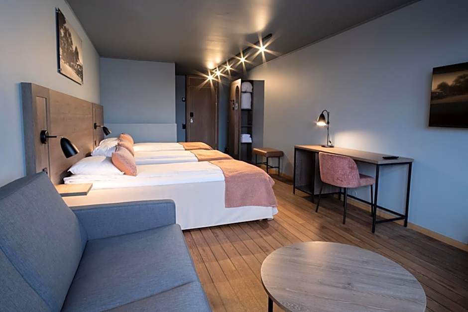 These comfortable deluxe double rooms have a 71 in wide bed, and an incredible view of Akerselva and Grünerløkka. The rooms have night tables, a desk with chair, armchair, wardrobe, flat screen TV, WIFI, hairdryer, Nespresso machine with a good selection coffee and snacks, suit case stand, hair and body products.